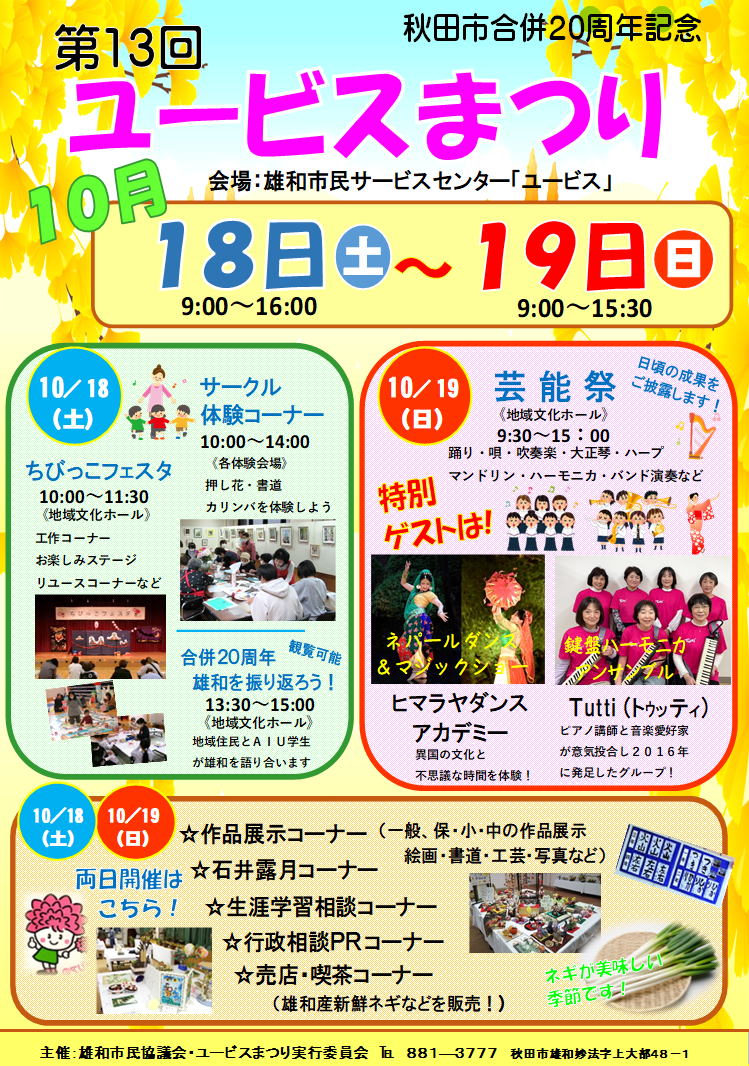 自主事業の実施や雄和市民サービスセンター「ユービス」の指定管理者として施設管理を行っております。